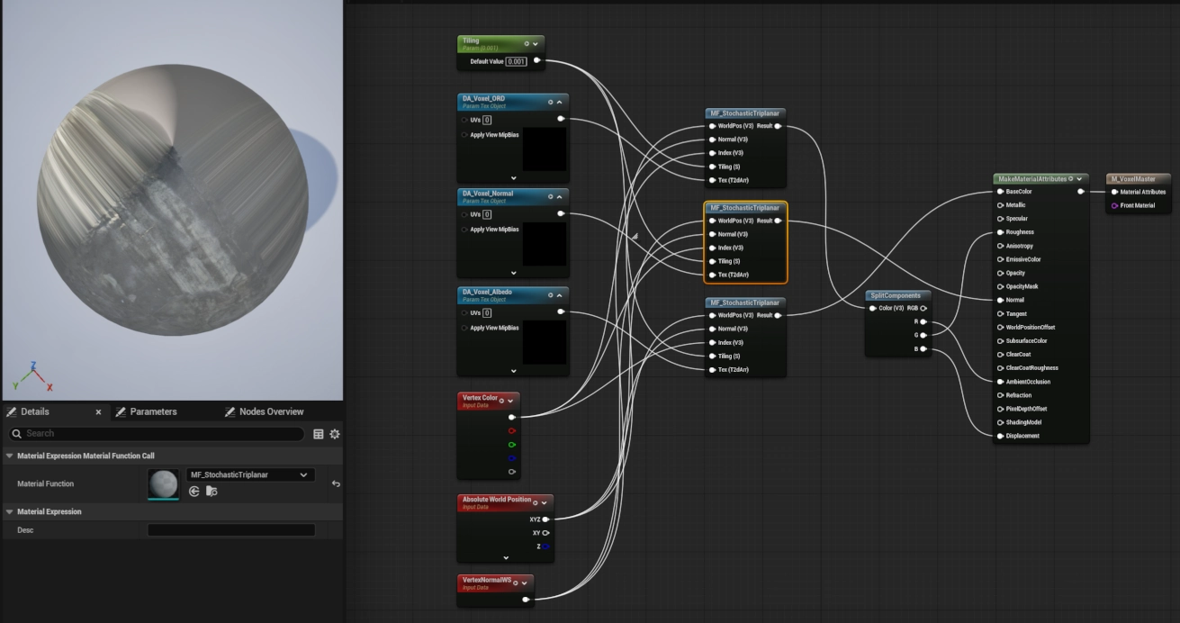 To solve this, I implemented Triplanar Mapping combined with Stochastic Sampling, although im not very confident that everything is implemented 100% correct, it does somehow look good…
